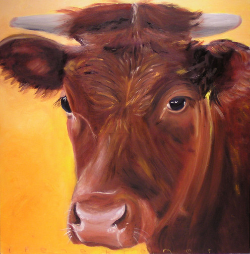 Irene ( geb.datum: 12-2-1947) schildert sinds zij in de Betuwe woont (2002). Geinspireerd door het landschap waarin koeien zo nieuwsgierig om zich heen kijken.